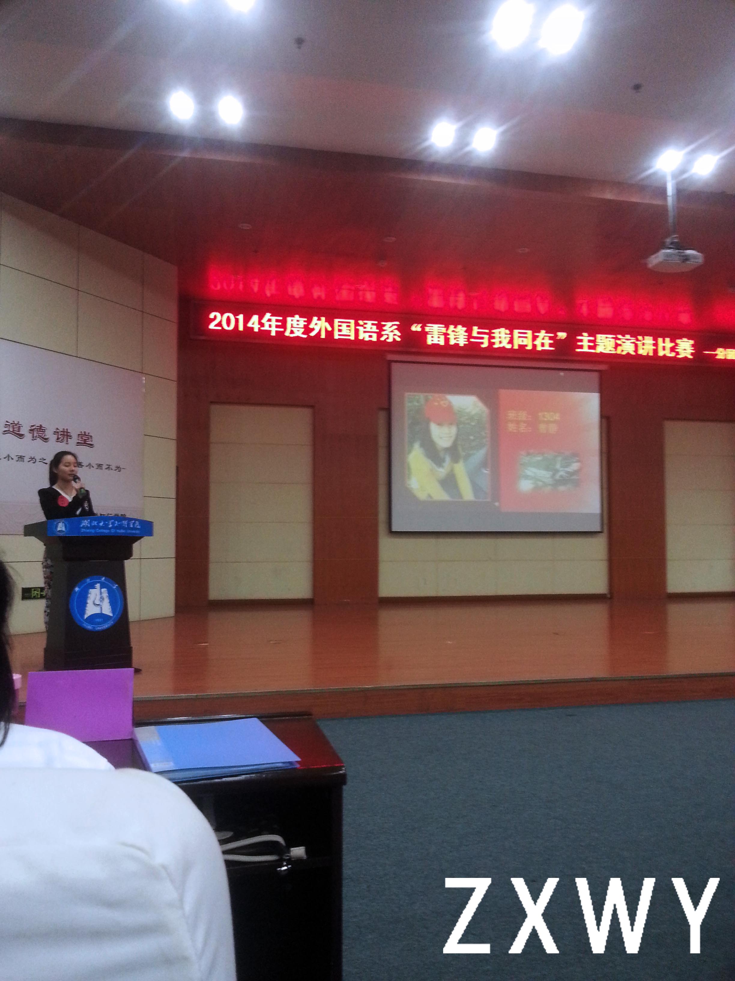本次比赛主要分为三个环节,第一环节是让选手能够充分发挥自己的演讲能力,演讲关于自己对雷锋的认识。第二环节是由外语系分团委青志大队代理队长蔡倩倩发表在雷锋月我系的活动总结,而最后是由我系合唱队唱《同一首歌》,在整个演讲比赛里各个参赛者表演自己,展现自我,当杨梦蝶发表自己的演讲,慷慨淋漓,赢得了观众的热烈掌声。还有黄延康全英文演讲也让观众叹为观止,当然还有其他选手的精彩表演,让观众不时爆出热烈掌声。