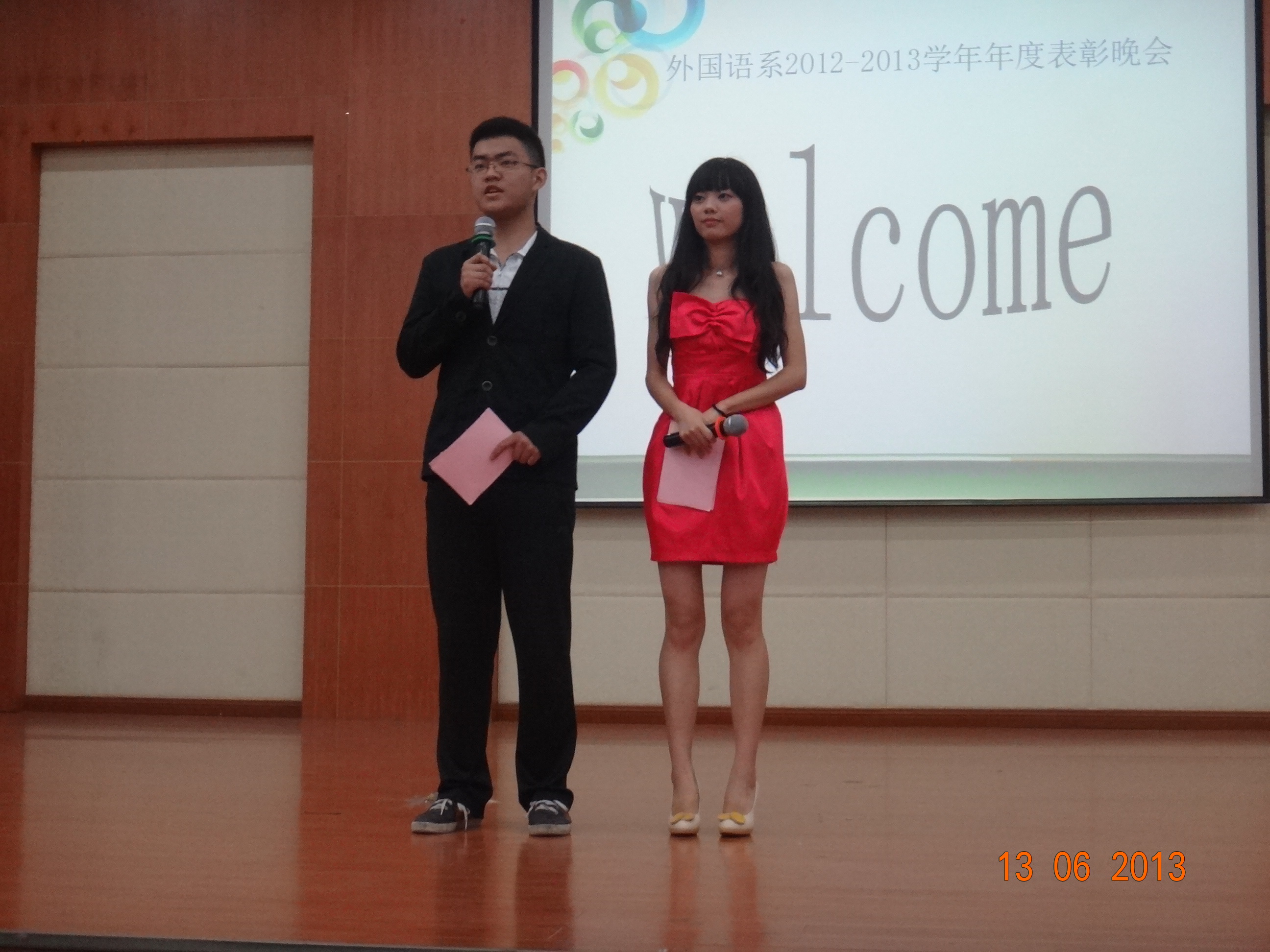 2013年6月13日晚上六点半,外国语2012-2013学年年度表彰大会在学术报告厅201隆重举行。系书记刘克、外语系全体辅导员与现场四百余名学生一起观看了颁奖晚会。