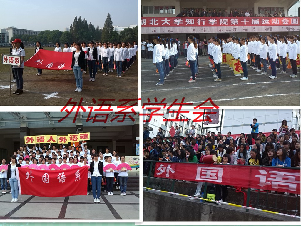 整个运动会的开幕伴随着各系方阵的入场而开始,我系方阵整齐划一,精神抖擞,参加方阵的同学们迈着昂扬的步伐、喊着激动人心的口号向全院展示出了“外语人、外语魂”的积极面貌。开幕式结束后,全院运动项目依次进行。我系运动员全力以赴为着更高、更快。更强的目标而努力着。看台上的观众的呐喊助威和那清脆的腰鼓声伴着不绝的热情将赛事推向高潮。广播中来自外语系加油稿鼓舞着每一颗热血沸腾的心。经过一天的激烈角逐,外语系的运动健儿们获得了骄人的成绩。我系运动员小组100米中戴丹青同学获得预赛第一名、蔡诗雨同学获得决赛第四名,小组200米中戴丹青同学获得决赛和预赛第一名、蔡诗雨同学获得决赛和预赛第一名、戴领同学获得预赛第一名、胡思同学获得预赛第一名、朱羽妍同学获得预赛第二名、杨淑凤同学获得决赛第四名,800米中张祥玉同学获得第三名。