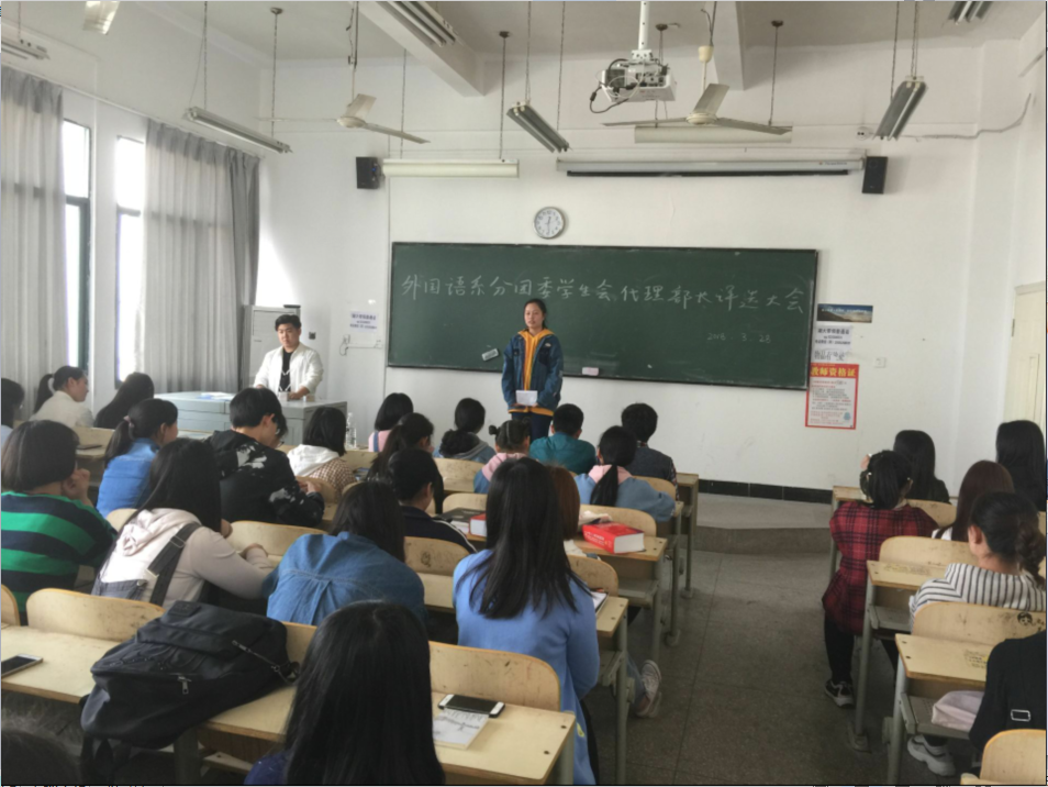 3月28日中午,外国语系分团委学生会全体成员于三教205成功召开13届分团委代理干部评选大会,本次会议目的在于让分团委学生会中即将面临专四考试的干部能有充足的时间备考,同时也使大一干事能得到更多的锻炼,进一步提高自己的工作能力。(向蕊、黄秋满)
