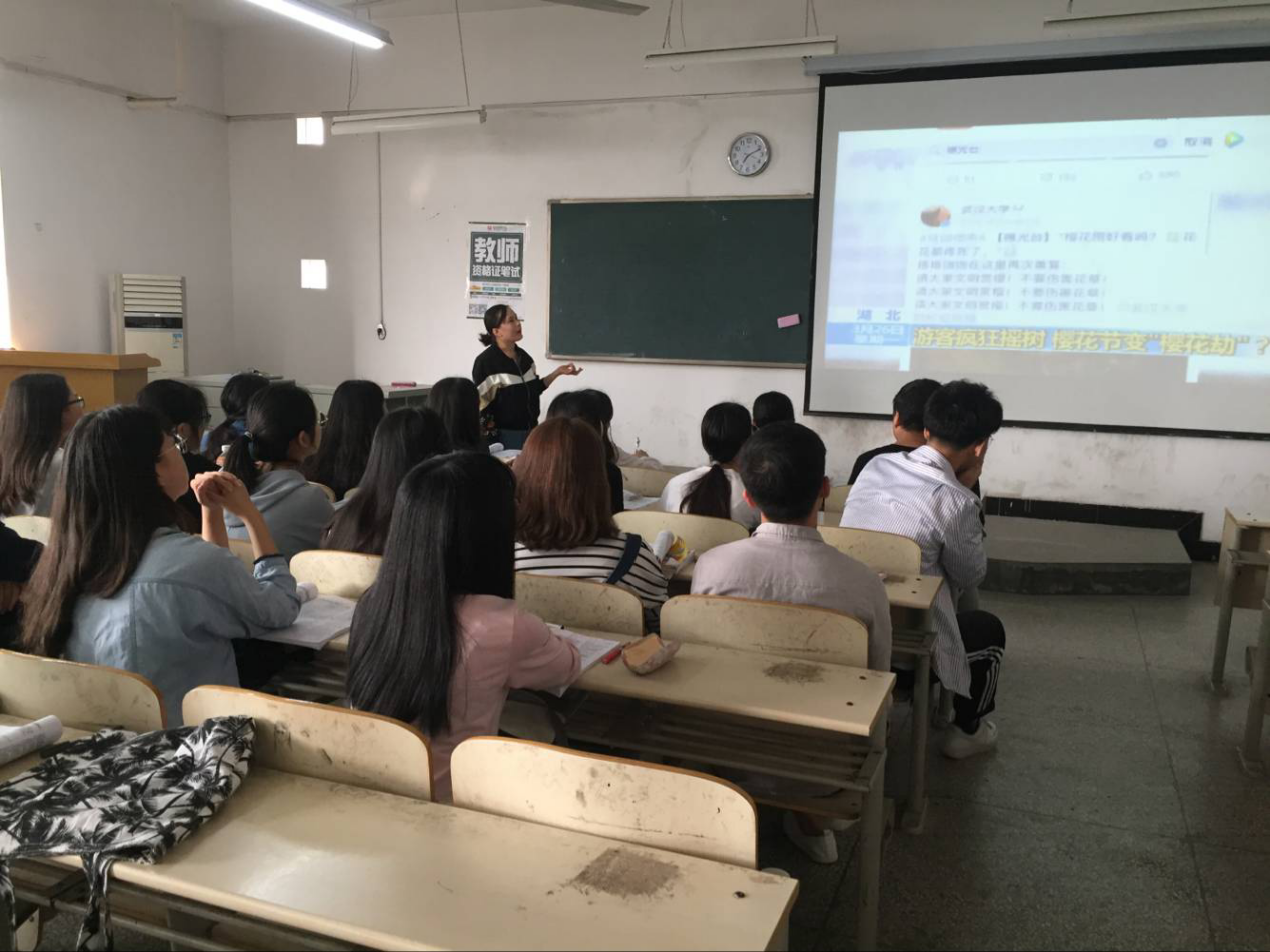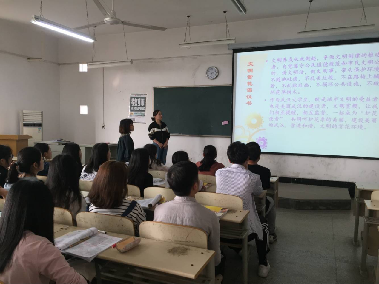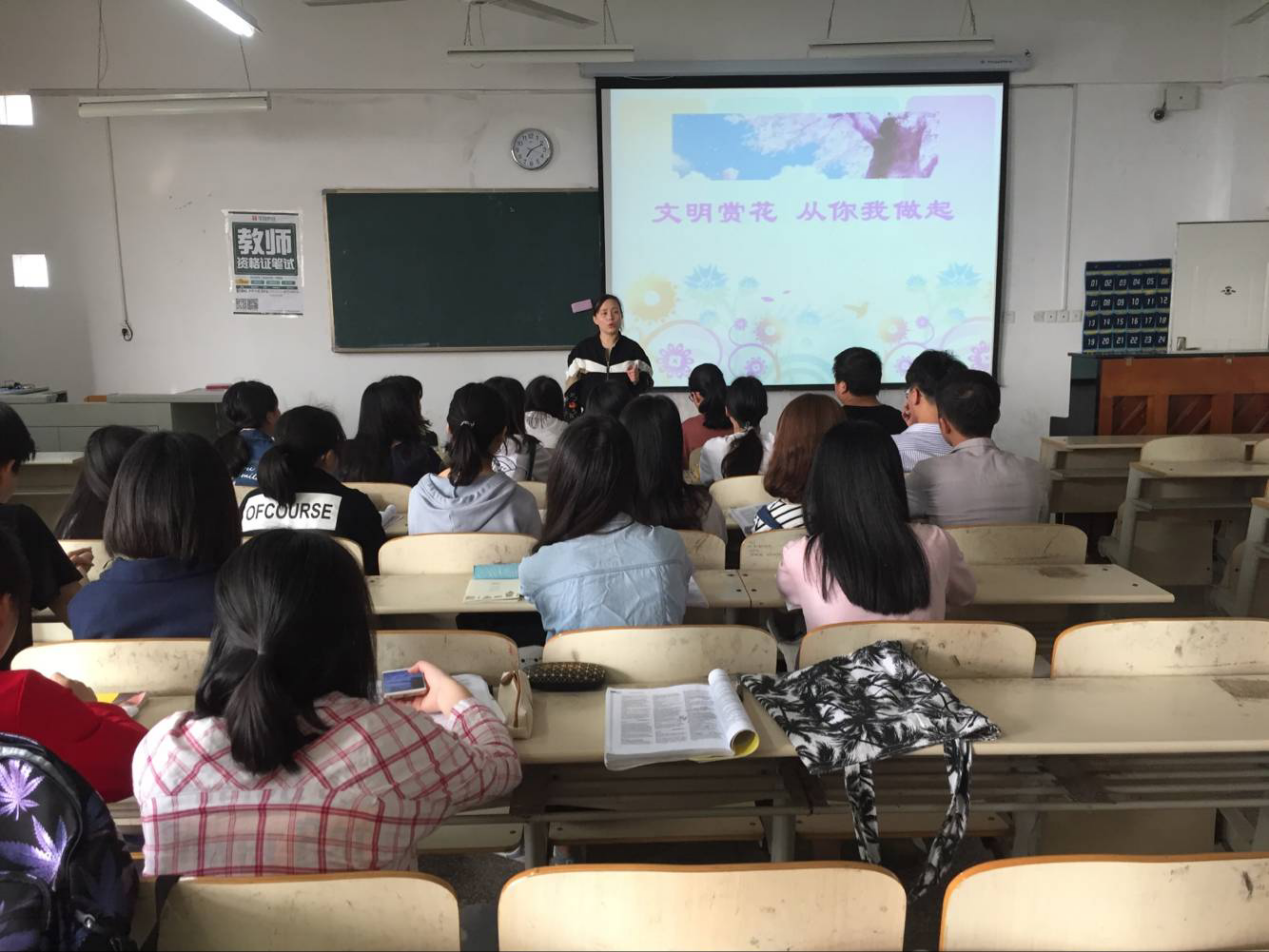 4月2日,我系辅导员向蕊老师于4教509在法语1702班开展了主题为“文明赏花 从你我做起”的微课。课上向老师由“男子武大校园剧烈摇樱花”的视频导入,列举了许多不文明赏花现象,引发同学们热烈讨论,最后班长宣读文明赏花倡议书,呼吁大家一起成为“护花使者”,共同呵护花季的美丽,建设美丽的武汉,营造和谐、文明的赏花环境。(供稿人:向蕊)
