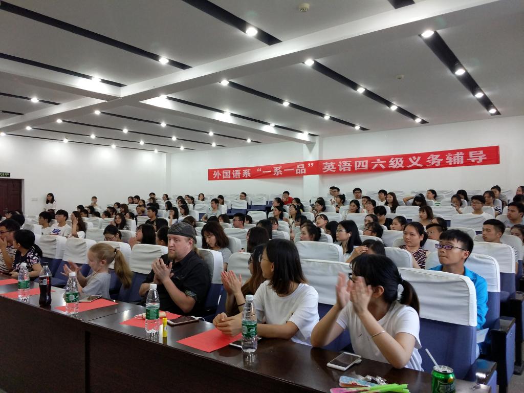 5月17日晚六点半,由我校外国语系分团委分社联和英语四六级社团联合负责的四六级义务辅导活动开幕式在学术报告厅302举行,本次活动是为了打造良好的学术氛围以及帮助全院学子奋战大学生英语四六级,参加本次活动的有辅导员李婧妮老师、程星老师、四六级社团负责人、院级组织负责人以及外国语系分团委全体干部和部分同学。