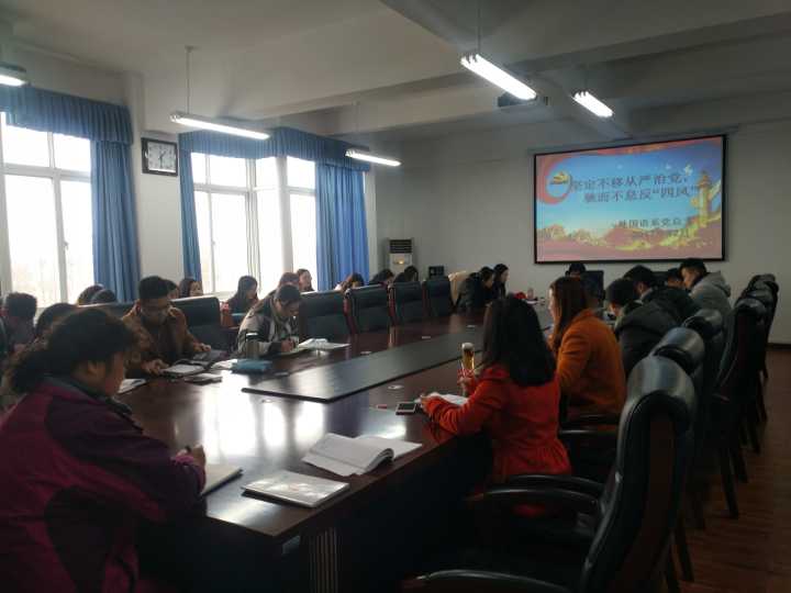 (通讯员:任子悦)2018年1月8日,外国语系召开贯彻“八项规定”精神及反对“四风”工作会议,刘克书记主持了本次会议,我系全体党员教师参加学习。