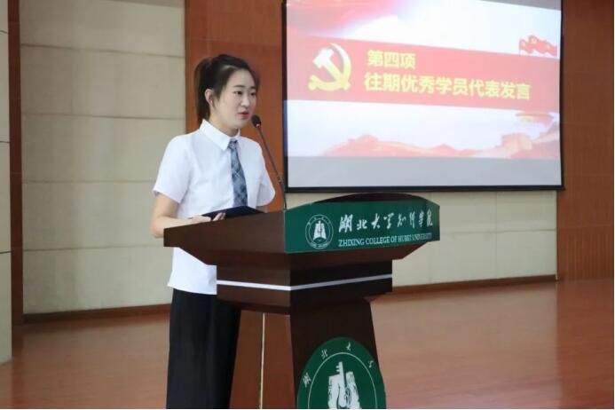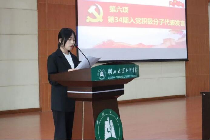 第34期党校学员贾琦薇代表第34期全体党校学员进行了发言,她分享了对党的认识,告诉同学们应当如何发挥好先锋模范作用,严格要求自己,努力地向党组织靠拢,争取早日成为一名合格地的共产党员。
