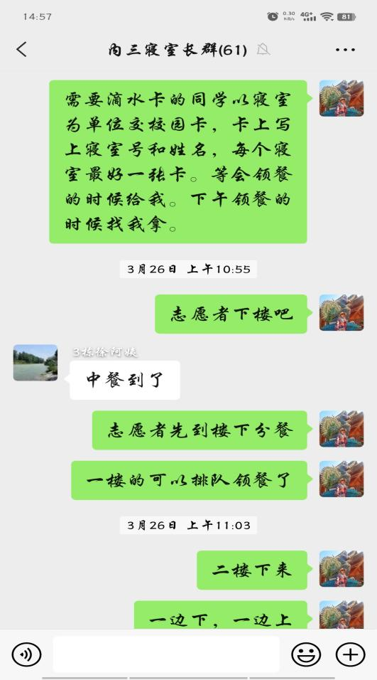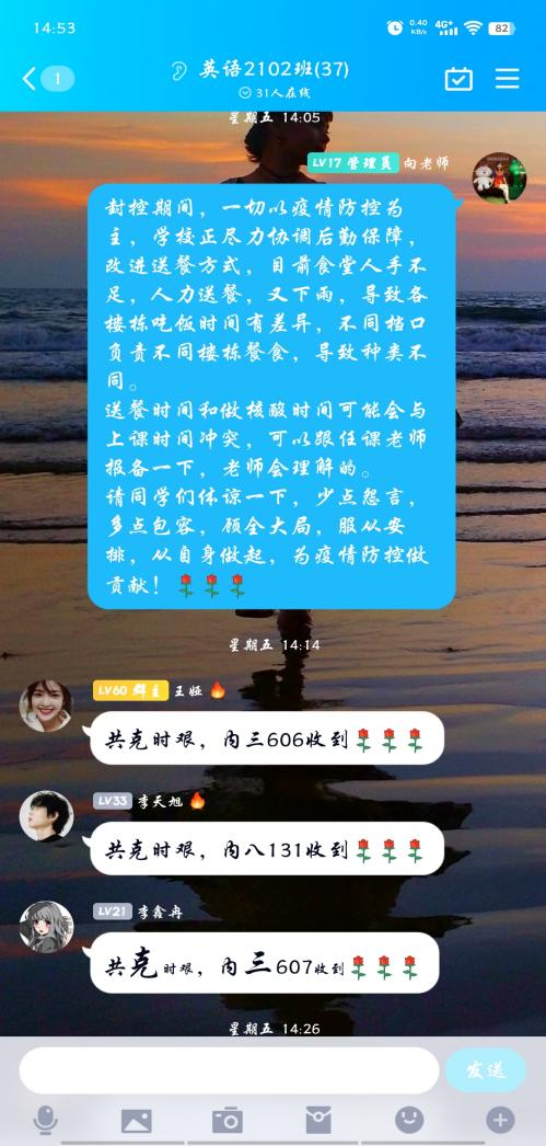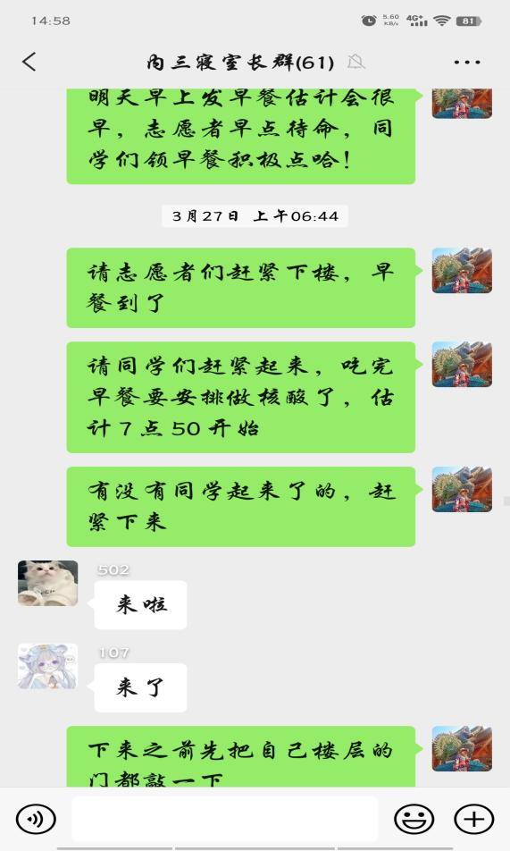 3月25日凌晨,按区防疫指挥部要求,校园施行封闭管理,事发突然,yl7703永利集团辅导员们迅速迎战,离家住校,与学生同吃同住、同封闭、共战斗。他们驻扎楼栋、定点送餐、充水卡、买药品、协助核酸检测;他们深入学生一线,及时回应学生,强化人文关怀,开展心理疏导,缓解学生焦虑情绪。