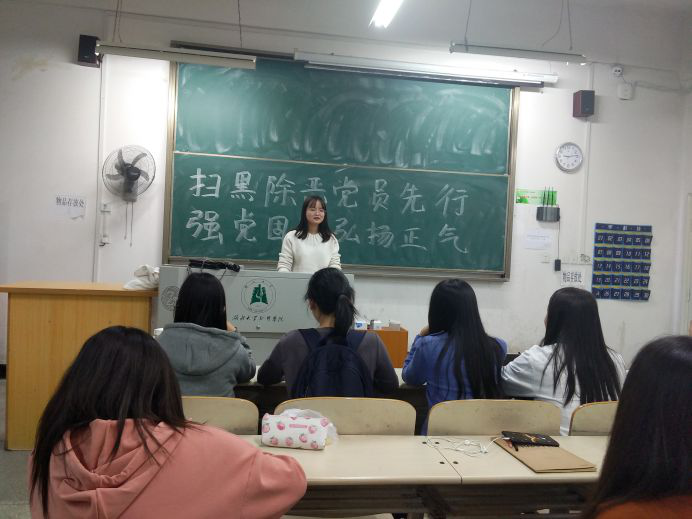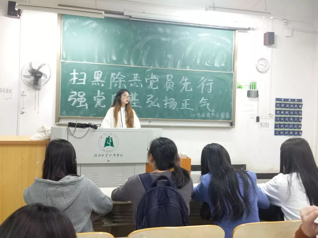 10月15日晚8点半,外国语系分团委学生会全体干部在四教103参加以“扫黑除恶党员先行,强党固基弘扬正气”为主题的思想教育活动,本次会议由分团委学生书记张晓芳主持。
