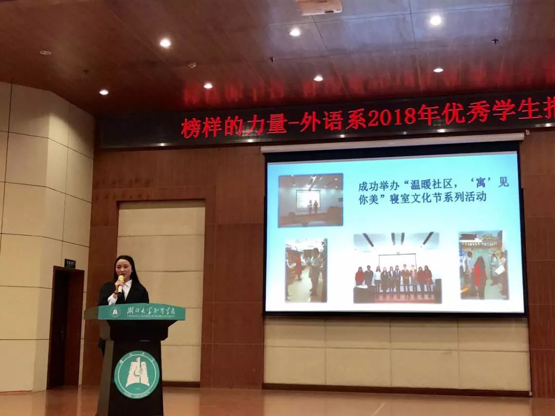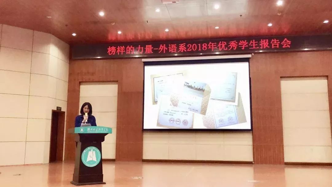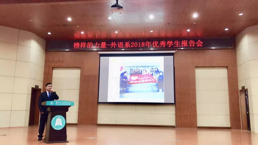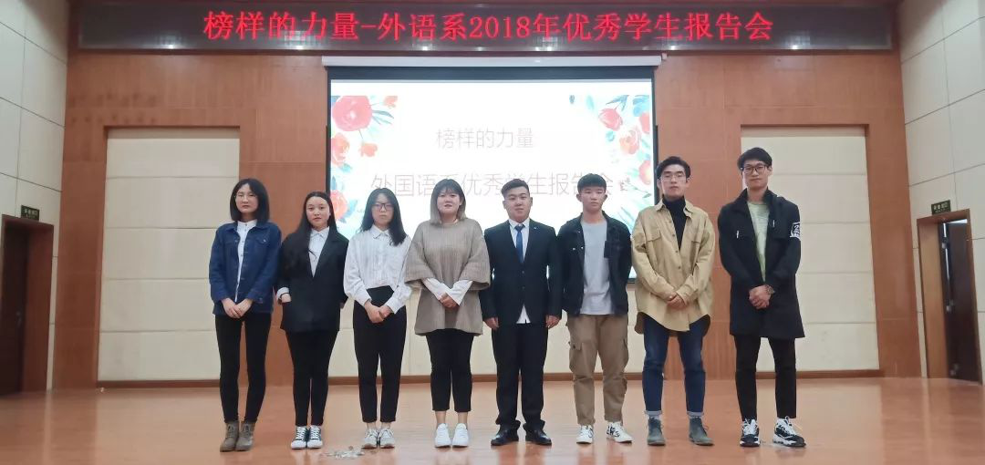 学榜样,立青春鸿鹄志;做标兵,筑中国复兴梦。外国语系于10月18号晚上在报告厅201举行“榜样的力量”优秀学生报告会,会上,八位优秀学生的分享交流充满了向上向善的青春正能量,具有很强的感染力和启发性。优秀学生报告会是新生入学教育重要环节,着力打造大学生思想政治教育品牌。旨在用身边人、身边事传递“信念坚定、志存高远、勤勉好学、知行合一、自立自强”等青春名片,使全体新生学有榜样、赶有目标,自觉培育与践行社会主义核心价值观,争做担当民族复兴大任的时代新人。(向蕊)