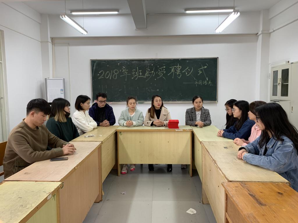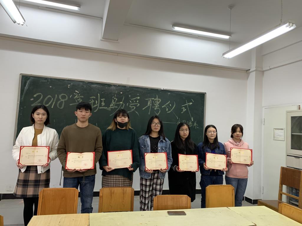 外国语系于11月27日中午在知音楼207举行2018级班助聘任仪式。会上,傅丽副书记对马妍等8名新生班助的工作和付出表示肯定和感谢,她强调本次班助聘任仪式既是仪式感的体现,也是对现阶段班助工作的总结。我系经过自荐、考核、面试三个环节从高年级学生中选拔出优秀人才担任班级助理,自新生报到以来班助们在学习、生活、工作中协助辅导员开展军训后勤服务、收集信息材料、完善班级制度、组建班团干部队伍等各项工作,积极发挥引领与纽带作用,为建设新生班级优良班风学风做出了重要贡献。(供稿人:向蕊)