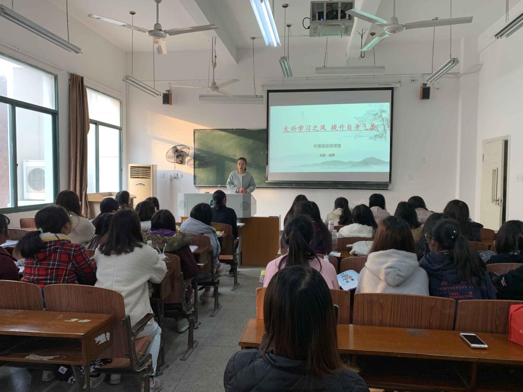 1、11月28日,向蕊老师在法语1801开展主题为“大兴学习之风 提升自身气质”的微课,从三个层面解读习近平总书记关于“劝学”的思想,分别解析“学如弓弩,才如箭镞”、“独学而无友,则孤陋而寡闻”、“博学之,审问之,慎思之,明辨之,笃行之”三个典故,阐述“为何学”、“学什么”、“怎么学”的问题。(供稿人:向蕊)