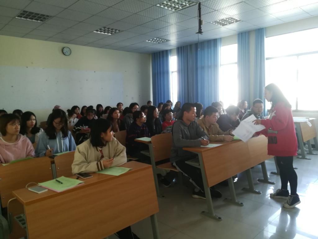 2.10月15日,向蕊老师召开16级法语班班会,发放就业协议书、就业推荐表、就业跟踪调查服务表、就业精准帮扶服务表,向老师就实习、就业、协议书的填写等问题进行了详细的讲解,要求毕业生们充分了解当前就业形势,树立正确的就业观,摆正就业心态,抓紧当前就业黄金期,积极参加双选会和学院专场招聘会。(供稿人:向蕊)