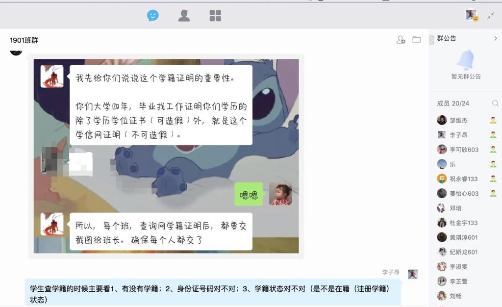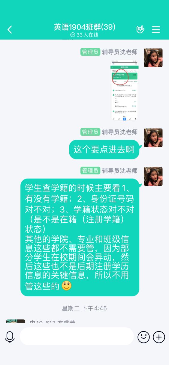 学籍管理是高等院校教学管理中必不可少的一个环节,也是学校教育教学工作顺利开展的重要保障。为切实维护学生合法权益,确保学籍注册信息的准确无误,本周学校要求19级辅导员指导学生开展学籍信息查询工作,我院坚持贯彻执行上级有关学籍管理工作的文件精神,从严要求,全面规范落实工作,细化分工,责任明确。学院辅导员指导19级学生进入学信网,对个人学籍的相关信息进行查询核实,主动解决学生查询过程中的各种问题。通过辅导员的有效指导和大力宣传,加上学生的自主配合和支持,充分提高了工作效率,学籍查询工作顺利完成!(供稿人:沈思)