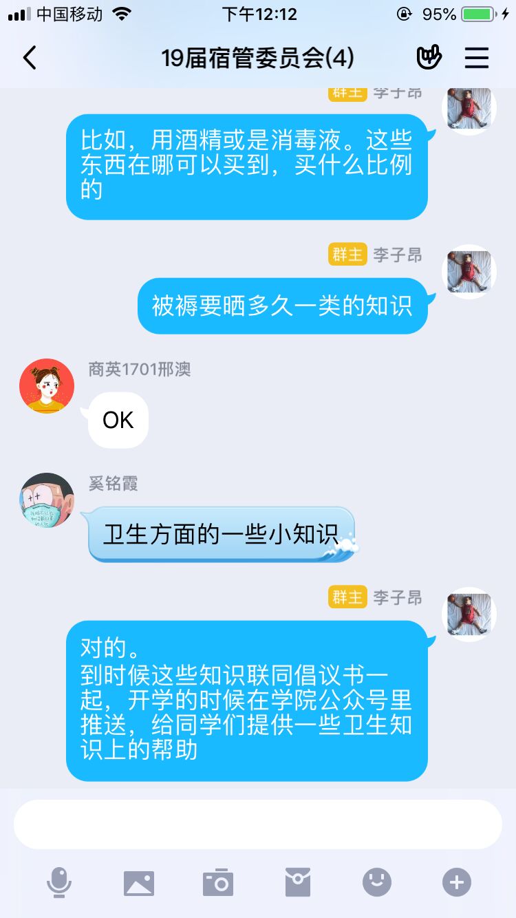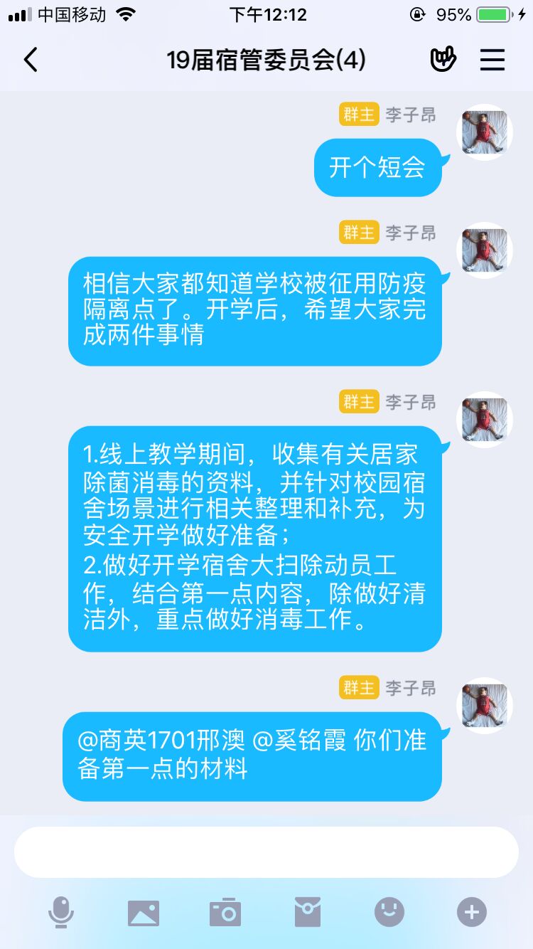 3月4日,yl7703永利集团宿管委员会在线上召开了本学期第一次会议。围绕我校宿舍征用背景,辅导员李子昂向宿管学生干部提出两点要求:1.线上教学期间,收集有关居家除菌消毒的资料,并针对校园宿舍场景进行相关整理和补充,为安全开学做好准备;2.做好开学宿舍大扫除动员工作,结合第一点内容,除做好清洁外,重点做好消毒工作。(供稿人:李子昂)