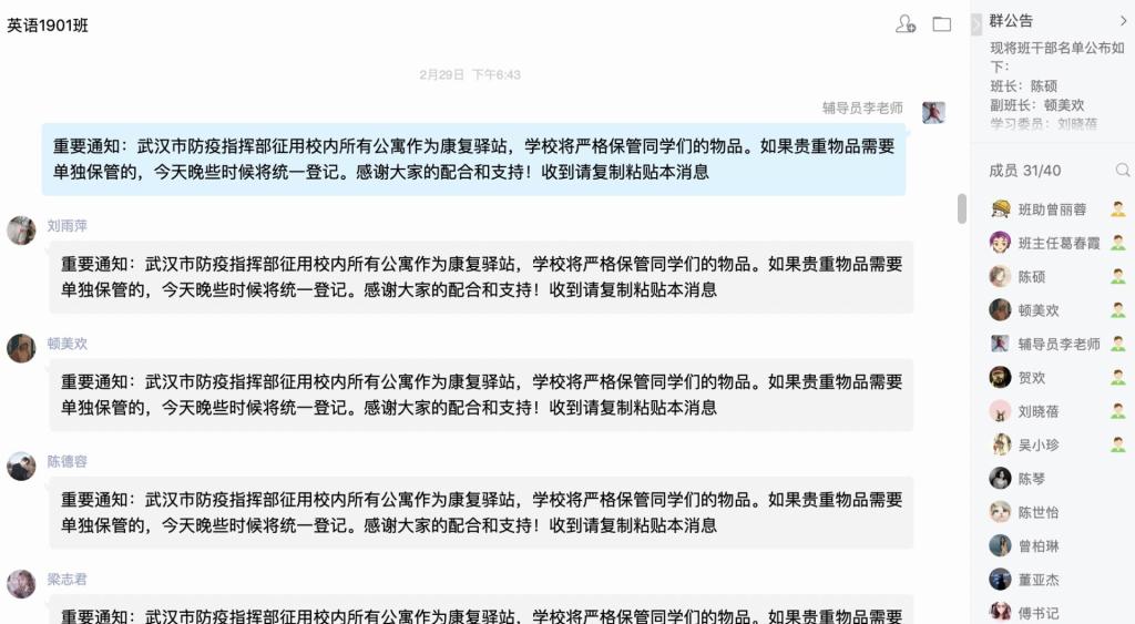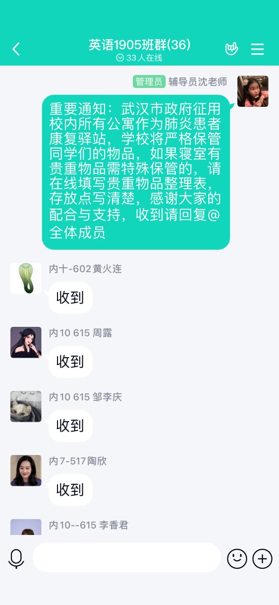 2月29日,我院接到校内寝室被征用为康复驿站的通知后,傅书记马上召开专题会议,统筹安排,明确分工,要求辅导员给学生做好解释工作。随后,各辅导员召开各班班会,向每一位学生传达征用通知,告知学校寝室物品整理标准,同时收集同学们的贵重物品放置地点,承诺会将贵重物品提前收纳,让同学们放心安心。同学们纷纷表示积极响应政府号召,支持康复驿站建设。(供稿人:向蕊)