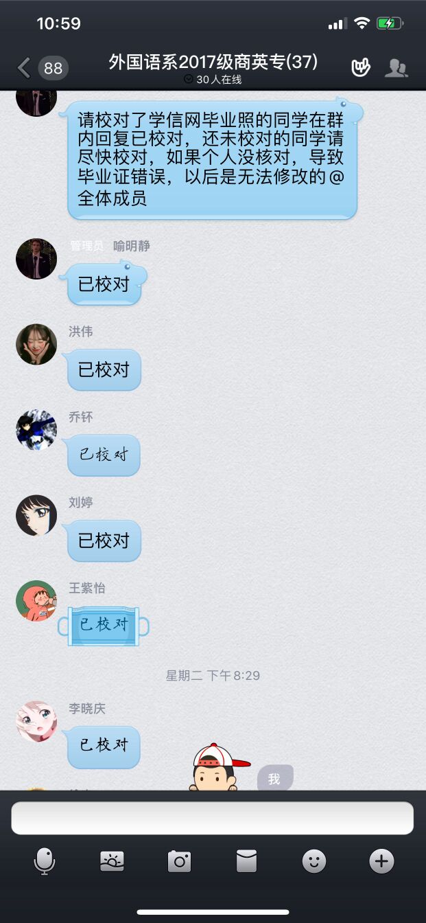 为符合学校学籍中心要求的核对毕业生网上毕业信息的工作要求,我院本周辅导员按照毕业生的姓名、班级、专业、照片,指导全院287名毕业生进行了逐一核对,为保证信息的准确性,核对采取点对点回复方式,即辅导员通过QQ、微信找学生本人核对信息,同时了解学生目前的工作和论文的完成情况,核对毕业信息的同时也能掌握学生目前的大致状况。经过两天的细致核对,我院毕业生信息全部检查完毕,无一人信息有误。(供稿人:沈思)