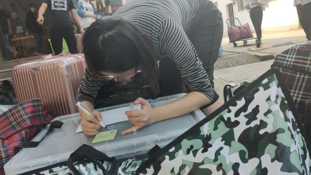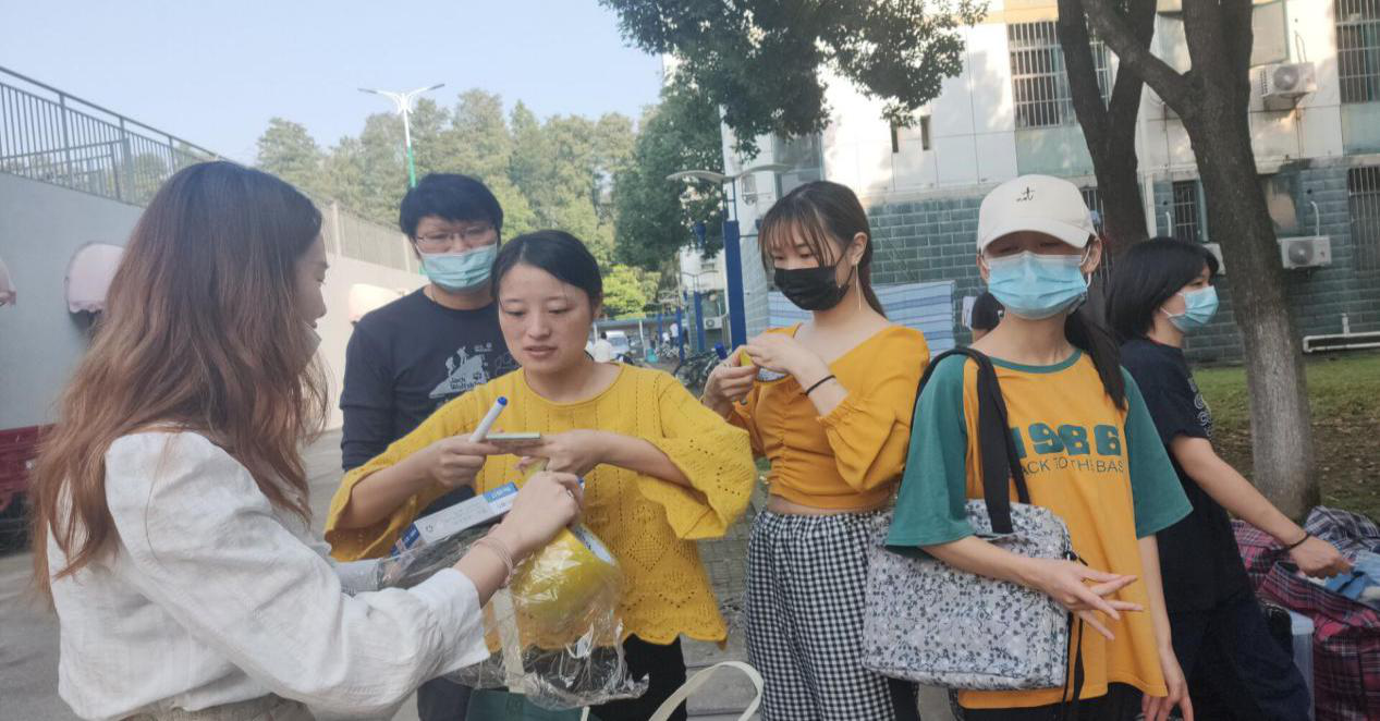 为同学分发便利贴,记号笔,胶带在各自行李上做好标记,方便之后男生帮助女生将行李送到各个寝室,实现两个楼栋包裹的全程记录和跟进,保障各环节无误实现无缝对接。在此之前,由刘帅老师带领三栋各个寝室代表领取学校免费为学生提供的编织袋,同学们按照要求打包行李并做好个人信息的标注。