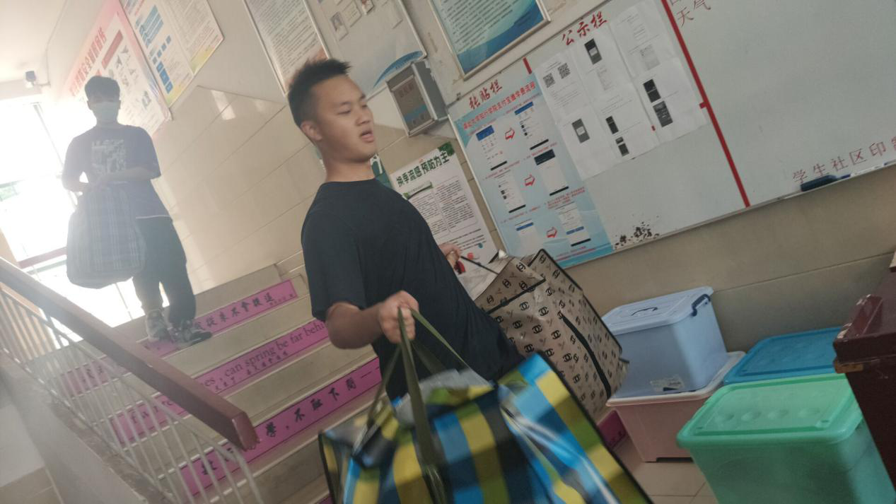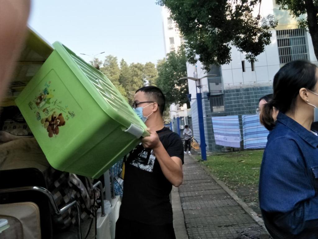虽然东西很重,汗水浸湿了他们的衣服,他们依然坚持,一直奋斗在搬寝前线的热心男生