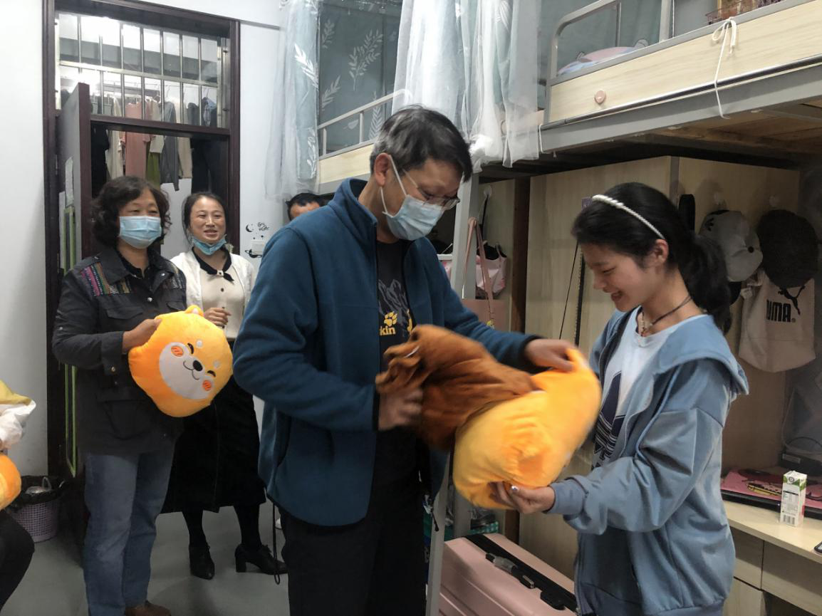领导们亲切的与学生交谈,询问学生学习和生活等情况,并提醒同学们在平常的生活中,务必注意财物安全、用电安全、人身安全,保持宿舍卫生、加强内务整理;同时领导和老师们也给同学们发放了保暖抱枕。