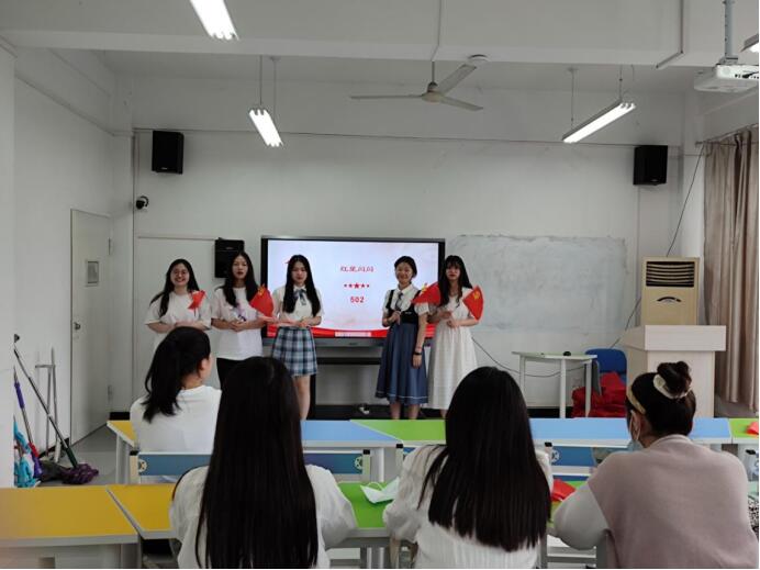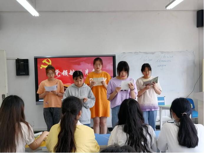 为弘扬时代主旋律,传承红色革命精神,培养学生爱国情操,展示学生奋发向上、朝气蓬勃的精神面貌,2019级法语班组织开展“颂党恩 抒党情”红歌传唱活动。同学们用一首首脍炙人口、经久不衰的红歌回顾历史,缅怀先烈,唱响了拼搏奋进的时代旋律,展现了同学们爱党、爱国,朝气蓬勃、奋发进取的精神面貌,抒发了新时代青年的理想、胸怀与担当。(供稿人:向蕊)