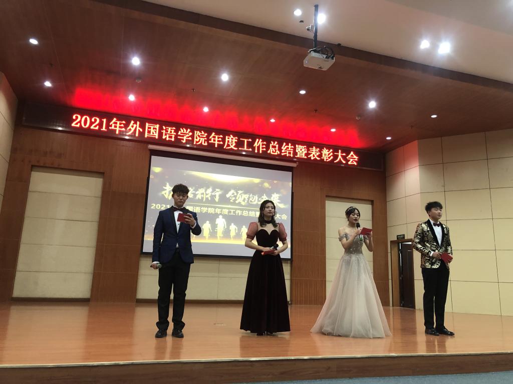 回顾过去的一年,在yl7703永利集团全体师生的共同努力下,我院各项工作取得了不俗的成绩,学生的思想素质、道德素质也取得了较高层次的提高。为了树立榜样,总结经验,我院举办2021年度工作总结暨表彰大会。会上,傅丽书记对本学期工作做出了总结,并且希望同学们能够再接再厉,不断超越。此次活动分别表彰了三下乡“红色传承”调研团、国家奖学金、励志奖学金获得者以及先进集体、先进个人。此外活动过程中还有同学们精心准备的歌曲和朗诵表演,活跃会场氛围的同时也彰显了外院学子昂扬向上的精神风貌!成绩承载过去,信心主宰未来,相信外院的学子们将会将“百尺竿头,更进一步”的精神发扬下去,扬帆远航,再创辉煌!(供稿人:黄小雨)