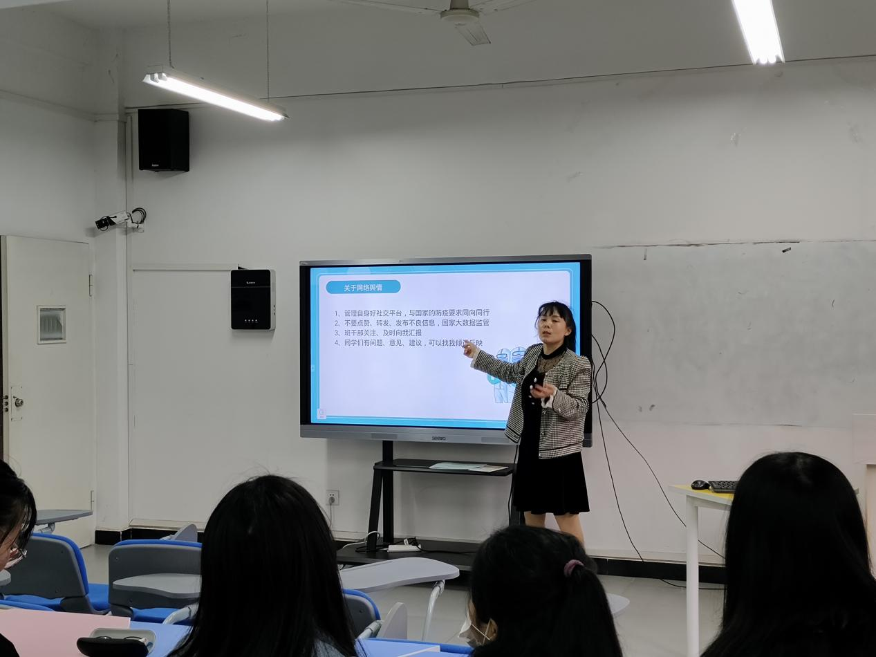 2. 本周,向蕊老师召开在校班级开展“人人都是防线”主题班会,从疫情防控倡议、快递收取防疫、心理防疫指导和网络舆情教育展开,提醒同学们提高思想认识,养成良好卫生习惯,加强自我健康管理。(供稿人:向蕊)