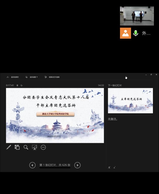 本周yl7703永利集团开展第十八届分团委学生会及青志大队竞选答辩会,傅丽书记、指导老师黄小雨、分团委学生会及青志大队书记主席团全体成员出席此次答辩大会,48名竞选人参加竞选答辩。为深入推进民主,按照民主集中制的原则,在公开、公平、公正的前提下,本次会议采取线上线下相结合形式,全程通过腾讯会议进行直播,各班级团支部代表于线上观看并进行投票,同时也应疫情防控要求,减少人员聚集,各竞选人分批次进入会场。(供稿人:黄小雨)