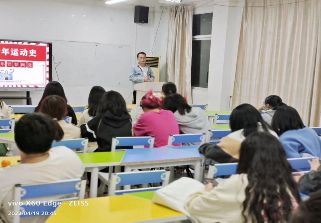 4. 4月19日,法语2001班团支部开展“喜迎二十大,永远跟党走,奋进新征程”暨学习“党的青年运动史”主题团日活动。全体共青团员参加此次活动。团支部书记凌胜美围绕“党的青年运动史”主线,从共青团组织的诞生、艰苦卓绝的早期斗争、组织机构的构建和完善、规模的扩大和理论观点的日益成熟等多个方面对党的青年运动历史进行了介绍,辅导员程星老师结合青年学生成长历程中可能遇到的问题,找准差距,分享工作经验,交流学习规划,激励青年学生志存高远、脚踏实地、积极进取,争做有理想、有本领、有担当的新时代青年。(供稿人:程星)