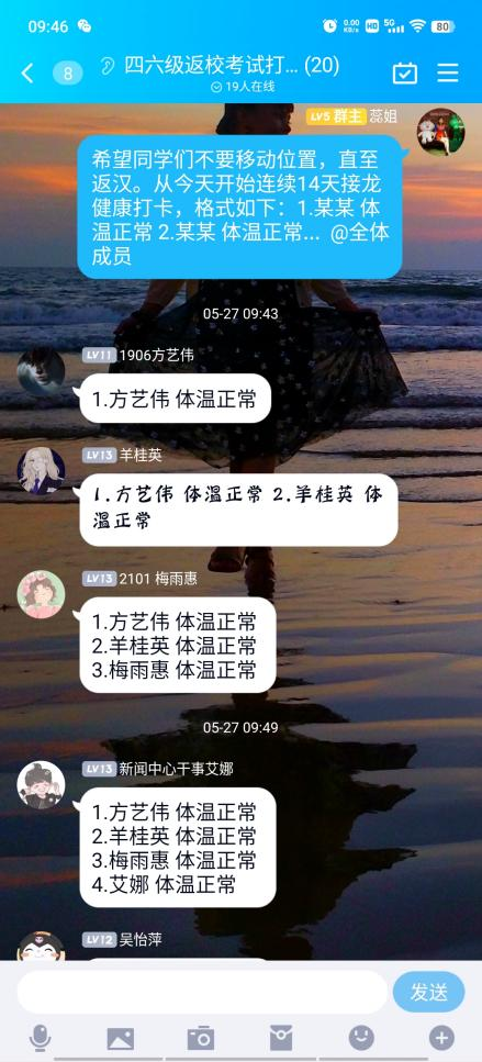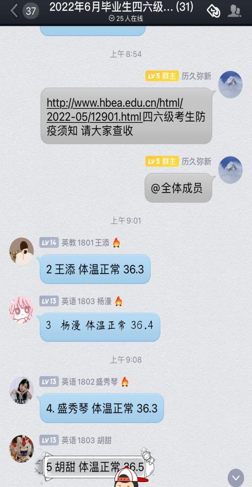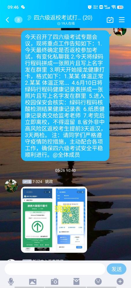 临近四六级考试,根据《yl7703永利集团四六级考试工作方案》要求,外院辅导员们建立四六级返校考试QQ群,审核绿码、行程码,告知学校关于四六级疫情防控须知,督促每天在群内接龙健康打卡;单独联系省外返校考生,妥善安排居家检测事宜,确保我校2022年上半年全国大学英语四、六级考试笔试安全平稳顺利进行。(供稿人:向蕊)