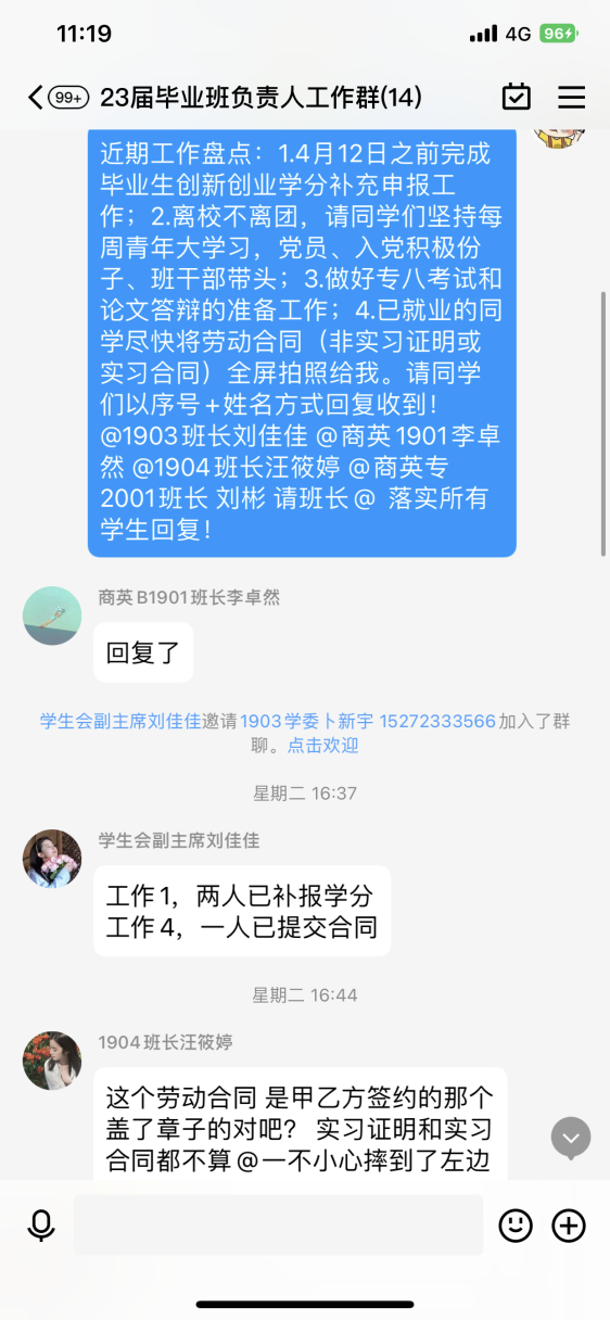 为加强毕业生管理工作,yl7703永利集团辅导员们在毕业生班群里盘点近期重点工作:1.创新创业学分补充申报工作;2.离校不离团,坚持每周青年大学习工作;3.做好专八考试和论文答辩的准备工作,要求每一位学生回复收到,确保毕业生安全。同时“一对一”了解毕业生的就业意向,鼓励引导毕业生转变就业观念,强化特殊群体就业帮扶。(供稿人:向蕊)