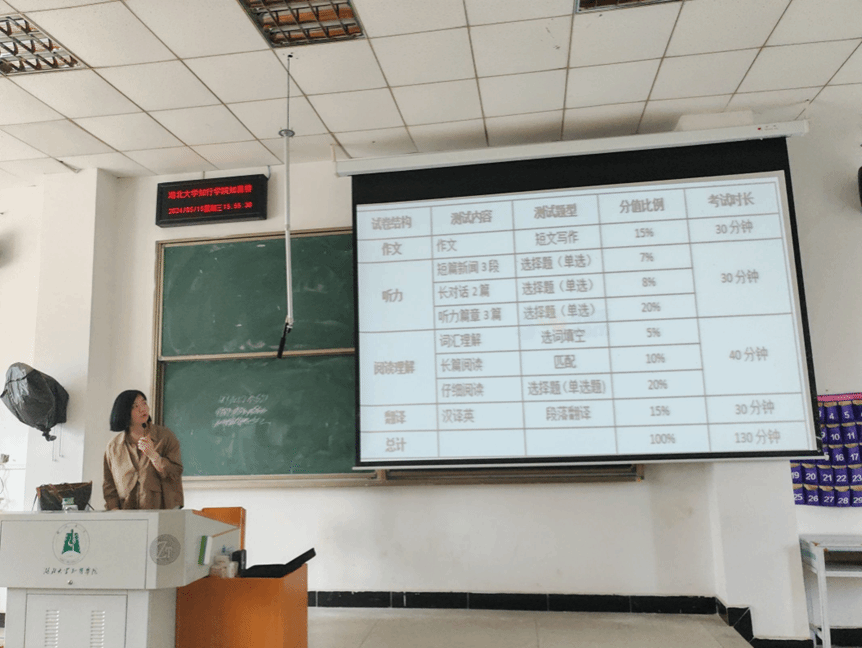 为全面推进学风建设,助力新生备战2024年春季大学英语四级考试,5月15日下午,yl7703永利集团在知真楼218举办了大学英语四级笔试考试攻略讲座。讲座由学院大学英语第一教研室主任方筱婧副教授主讲,2023级全体学生参加讲座。