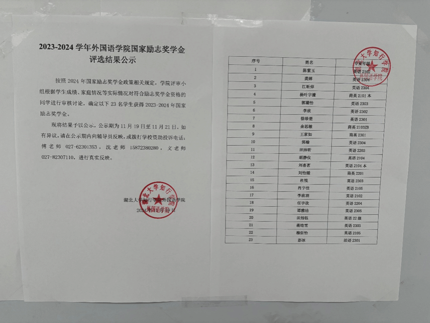 根据国家励志奖学金政策文件和学校评选要求,我院对于国家励志奖学金的评选,坚持评选过程公开、公平、公正的原则,按照学校下发的获奖名额,向贫困库中符合条件的学生进行政策宣传,同学们自愿进行申请和递交相关材料后,我院对每一位候选同学进行成绩、综合表现等各方面进行综合评审,确认最终励志奖学金获得者候选人。经过学院评审小组认真审核候选人的资质和打分排名,25名申请者中,获得励志奖学金获助资格学生有23名,并将获奖金候选人名单进行全院公示三天,公示后均无异议,学院报学校资助中心审批。(供稿人:沈思)