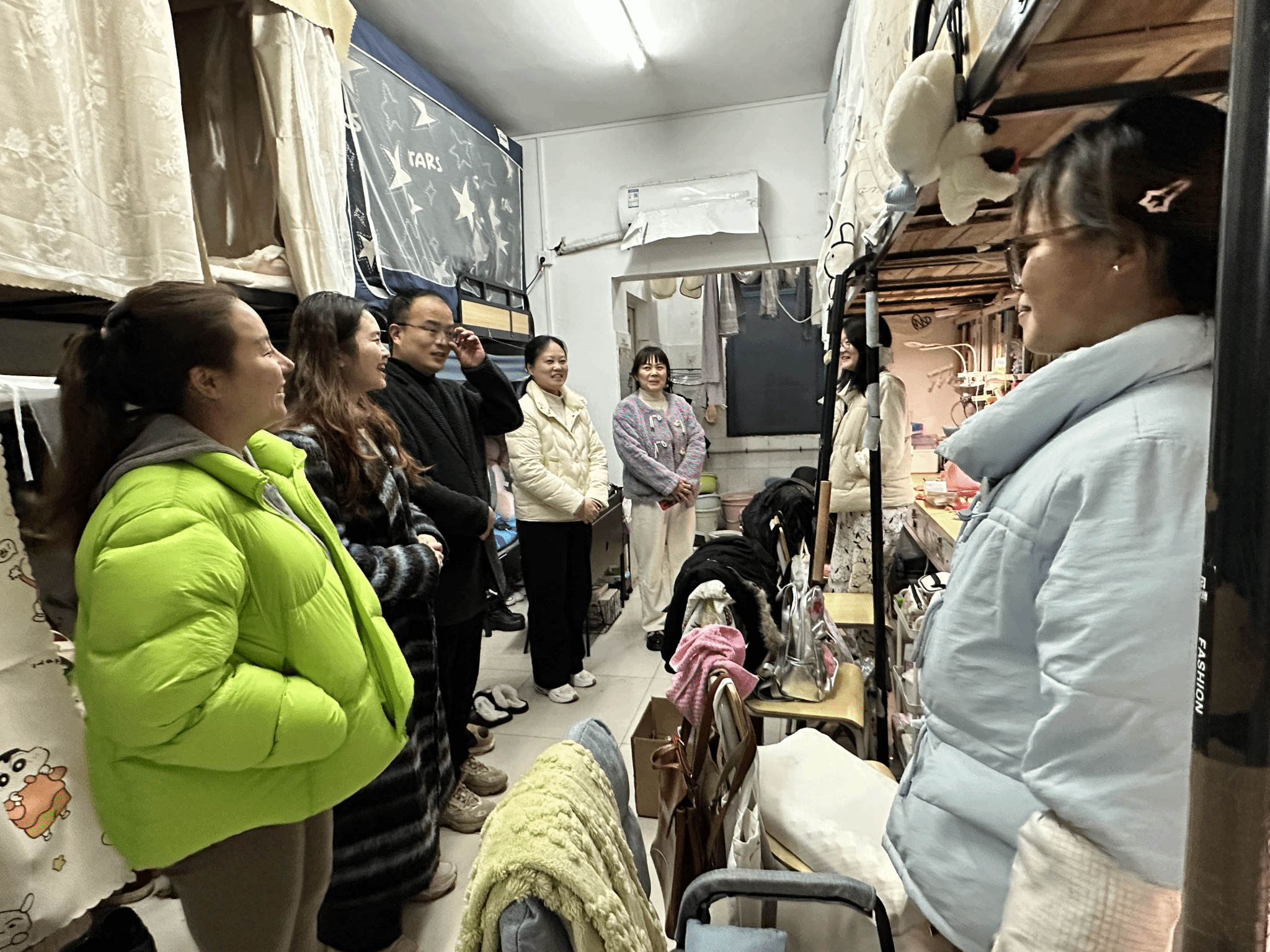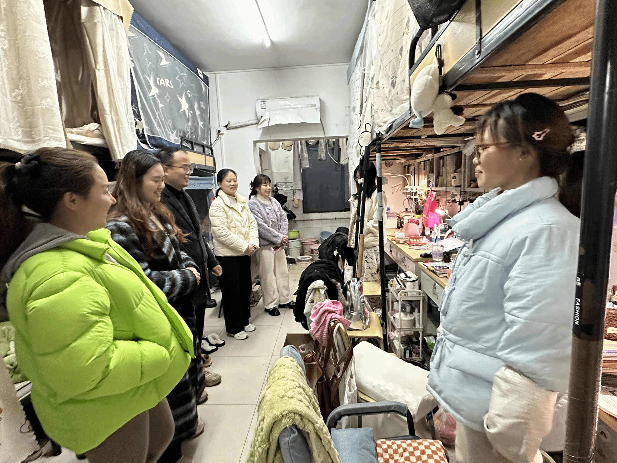 为深入了解开学学生住宿情况,帮助同学们开学尽快适应环境,2月16号晚间,yl7703永利集团党总支雷蕾副书记和辅导员们走访学生寝室,看望并慰问同学们。雷蕾副书记鼓励大家相互交流、相互帮助,专注学业,积极参加各项活动,享受校园生活。学院老师们深入宿舍,热情的话语,亲切的问候,不仅激励同学们在今后的学习中踏实努力,同时也使大家感受到了外语学院的关怀和大学生活的温馨,为今后学生管理工作的有序进行打下了坚实的基础。(供稿人:沈思)