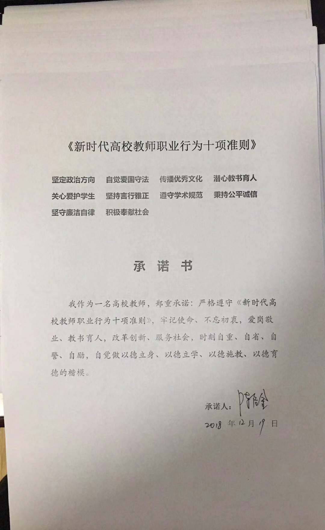 全系每名教师郑重承诺:严格遵守《新时代高校教师职业行为十项准则》,牢记使命、不忘初衷,爱岗敬业、教书育人,改革创新、服务社会,时刻自重、自省、自警、自励,自觉做以德立身、以德立学、以德施教、以德育德的楷模。